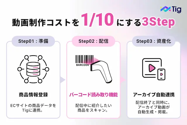 この10時間の重労働を、わずか1時間のライブ配信だけで完結させるのが、Tig LIVEの「アーカイブ自動連携機能」です。仕組みは極めてシンプルで、ライブ配信中にスタッフが商品バーコードを読み取るだけで、映像と商品データが紐付けられます。