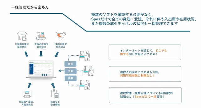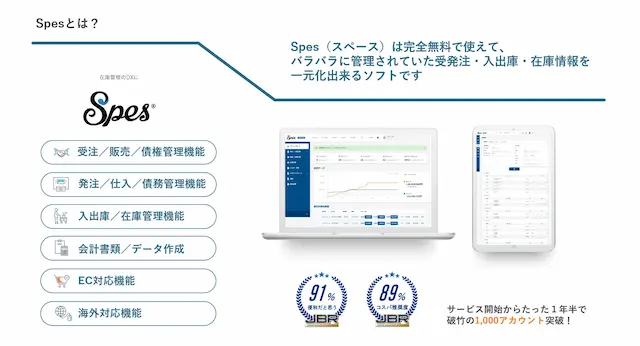 Spesは「すべての事業者に在庫管理を」をミッションに、在庫・発注・出荷・販売管理を誰でも簡単に行えるクラウドソフトを提供しています。今後も、物販事業者が物流やオペレーションの負担から解放され、持続的に成長できる環境づくりを支援してまいります。