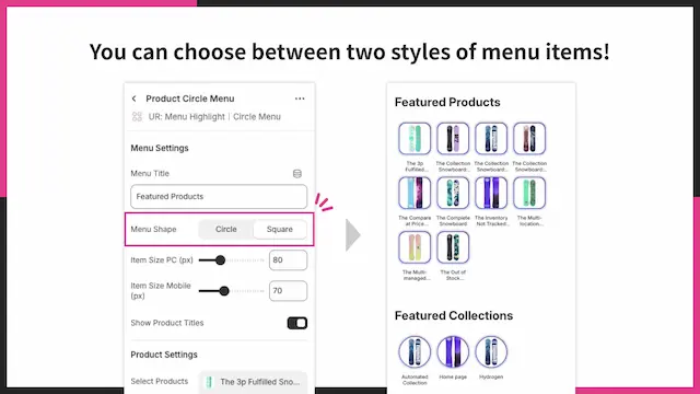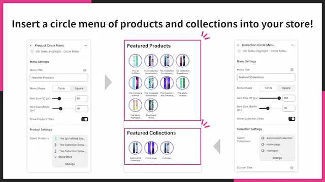 商品・コレクション用のサークルメニューを作成できる