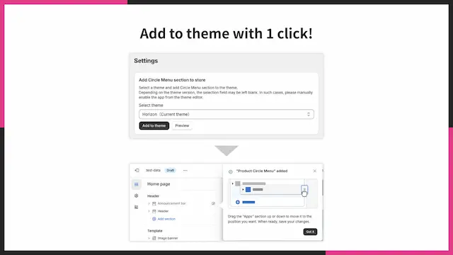アプリをインストール後、テーマエディタからアプリブロックを追加するだけで、サークル型アイコンメニューをすぐにストアへ表示できます。複雑な設定やコード編集は不要なため、初めてアプリを利用する方でも安心。導入の手間を抑えながら、ストアのナビゲーション強化をスムーズに実現できます。