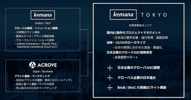 Kemanaは、Adobe Commerce (Magento)、Commercetools、Salesforce、Shopify Plusの公式パートナーとして、H&M、スターバックス、キヤノン、ラコステ、サムソナイト、POLO、TUMI、リーボック、ソニー・エンターテインメント、KOSEをはじめとする世界的ブランドのEC構築を手掛けるデジタルコマースエージェンシーです。このたび、Kemanaが有する世界標準の開発技術力と、ACROVEが有する国内EC市場における事業再生・販売支援ノウハウを相互補完することで、日本企業のEC海外進出における技術的課題を解消し、グローバル展開を加速させるべく、共同拠点「Kemana TOKYO」の開設に至りました。Kemana TOKYOでは、BtoCおよびBtoBの商材カテゴリーに関わらず、グローバルEC展開の支援が可能です。