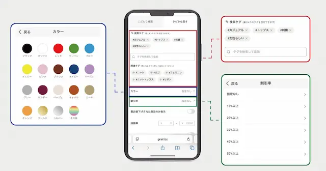 ハッシュタグから遷移した検索結果ページでは、「カラー」や「割引率」などの条件を追加して絞り込みが行えるようになりました。「タグの検索」と「関連タグ」から最大4つのハッシュタグを組み合わせ、アイテムを検索することが可能です。これによりユーザーの潜在的なニーズを可視化し、希望に近い商品をより簡単に表示できるようになり、顧客体験の向上に寄与します。