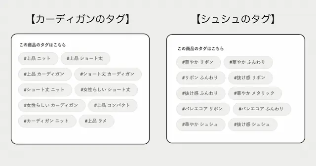 「カーディガン」「リボン」など汎用的なキーワードから「女性らしい」「抜け感」といったユーザー層の感覚に寄り添ったものまで、バラエティに富んだハッシュタグが商品詳細ページに表示されるようになりました。例えば「上品 ニット」「華やか リボン」などのキーワードを組み合わせることで、ユーザーが興味を持ちやすい内容となっています。これにより、より直感的に商品を探しやすくなり、サイト内の回遊性を向上させ、新たな商品との出会いを創出します。
