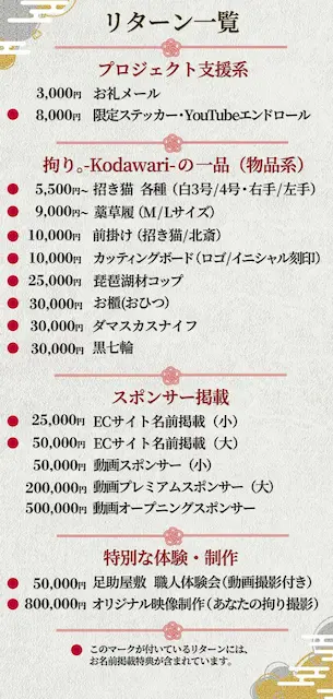 ご支援者の皆さまには、ご支援額に応じて特別なリターンをご用意しています。全国の選りすぐりの職人が作った作品や、スポンサー向け・体験型のリターンなど、『拘り。-Kodawari-』らしいラインナップを揃えました。