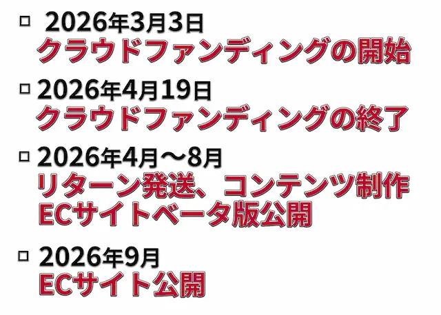 - 2026年4月〜6月:リターン発送、コンテンツ制作、ECサイトベータ版公開