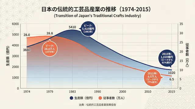 一般財団法人 伝統的工芸品産業振興協会の調査によると、伝統的工芸品産業の従事者数は、1979年の約28万8千人から2020年には約5万4千人へと、最盛期の5分の1以下にまで減少しています。需要が伸びず、生産量が減る中で、職人の仕事は「生業」として成り立ちにくくなり、新しくこの道に入る人も減っています。このままでは、貴重な技術が静かに途絶えてしまう恐れがあります。