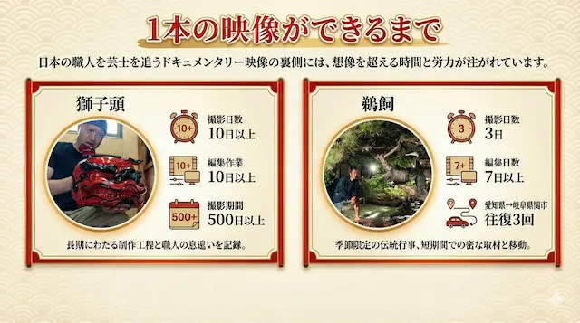 私たちは2023年から全国の職人を訪ね歩き、作品の制作工程はもちろん、素材の仕込み、道具の準備、家庭での暮らし、技への想いまで、“一切飛ばさない映像”として記録してきました。