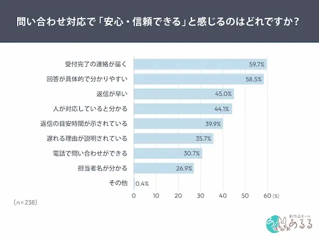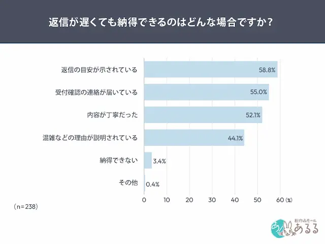 が上位に挙げられました。単に早く返信すること以上に「受付されている」「いつ返信されるか分かる」といった“見通しの共有”が安心感に直結していることが明らかになりました。