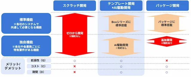 「Boxシリーズ×AI駆動開発」は、業務システムやプロダクト開発で頻繁に利用される標準機能をテンプレート化し、各企業で求められる独自機能はAI駆動開発によって開発することで、「フルスクラッチ開発」を低コスト・短期間・柔軟なカスタマイズ・将来的な拡張性で同時に実現する開発アプローチです。