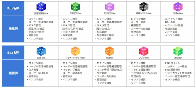 「Boxシリーズ」では、以下のような幅広い領域でのシステム開発を支援しています。テンプレートとAI駆動開発を組み合わせることで、従来よりも短期間かつ低コストでの開発を実現します。