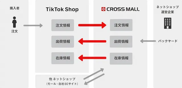 このたびの連携により、すでに「TikTok Shop」に出店されており、複数のネットショップを展開している企業さまは、「CROSS MALL」で注文情報の一元管理が可能になります。さらに、随時更新されている在庫数を「TikTok Shop」と共有することで、在庫の一元管理も可能です。また、「CROSS MALL」から「TikTok Shop」への出荷完了報告の自動連携も可能となり、業務効率化につながります。「TikTok Shop」に出店されていないネットショップ企業さまは、業務の変更なしに新たな販路を検討できます。