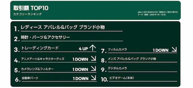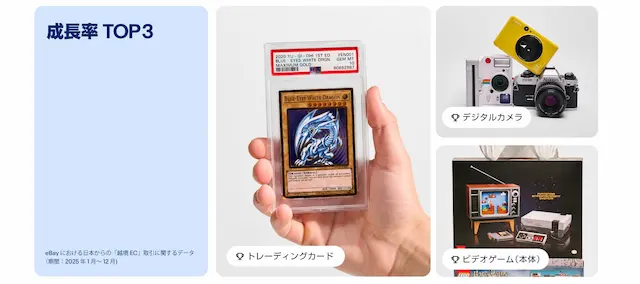 eBay公式販売・配送管理ツールである「eBaymag」の浸透や現地でのキャンペーン拡大により、従来米国向けに展開されていた商材が、特に英国や豪州での日本セラーの販売機会が拡大しました。中でも成長が顕著だったのは、日本製の中古カメラ、高級腕時計、トレーディングカードです。英国・豪州市場ではリユースやサステナブル志向が高く、品質管理への信頼性が評価されやすい傾向があります。