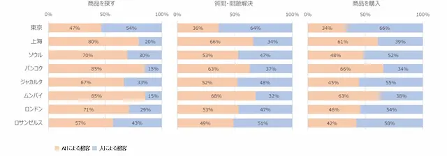 都市別にみると、実際の利用率や利用意向を反映して、ムンバイ、バンコク、上海ではいずれの段階でもAIに任せたいという回答が相対的に多い。「商品を探す」段階ではムンバイとバンコクが85%、上海が80%と高く、東京は47%にとどまっている。「商品を購入」でも、上海やバンコク、ムンバイでは「AI接客」への好みが「人による接客」を大きく上回った。