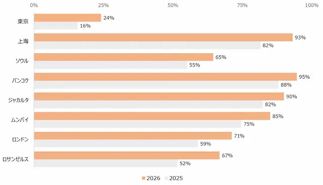 調査地域:東京(日本)、上海(中国)、ソウル(韓国)、ムンバイ(インド)、バンコク(タイ)、ジャカルタ(インドネシア)、ロサンゼルス(米国)、ロンドン(英国)