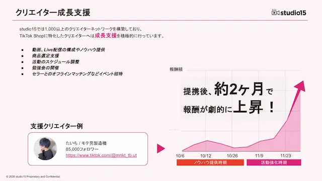 TikTokを中心としたショートムービー(短尺動画)領域で広告代理店事業・プロダクション事業を展開するstudio15株式会社(スタジオフィフティーン、本社:東京都世田谷区、代表取締役:岩佐 琢磨、以下 studio15)は、2026年3月18日に開催されたTikTok Shop Japan主催の招待制イベント「Creator & Seller Networking」に参加し、studio15が登壇したことをお知らせいたします。