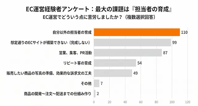 その背景には、EC運営の「育成の難しさ」があります。フォースター株式会社の調査によると、EC運営経験者200名のうち、最も多くの人が困難を感じていたのは「自分以外の担当者の育成」で、55.5%がこの項目を選択しています。EC業務では、接客、商品企画、広告運用、データ分析など幅広いスキルが求められるうえ、実務的な判断力や顧客対応力など、マニュアルだけでは伝えきれない要素も多く、指導する側にもECへの高い解像度が必要とされます。そのため、「自分で実施するのは容易でも、他者に任せるのは難しい」と感じる運営者が多いのが実情です。
