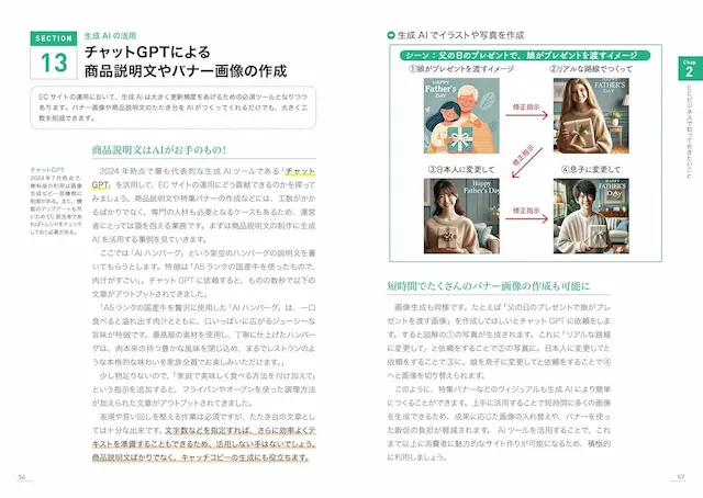 さらに本書では、ChatGPTやGeminiをはじめとする生成AIの活用についても解説。商品説明文の作成、バナー制作、カスタマーサポートなど、これまで人手で行っていた業務は、AIを前提とした設計へと変化しつつあります。本書では、こうした変化を踏まえ、「どの業務に、どのようにAIを活用するか」まで踏み込み、これからのEC運営に必要なAI時代のノウハウまで網羅しています。
