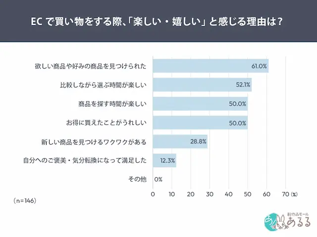 これらはいずれも「探す・比べる・見つける」といった探索行動に集中しており、EC体験の魅力が購入前のプロセスに強く寄っていることが読み取れます。