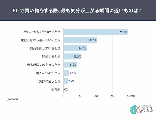 「オンライン購買で最も気分があがる瞬間」を尋ねたところ、39.7%の人が「欲しいものを見つけたとき」と回答しました。これにより、「見つける体験」が最も満足度が高いことがわかりました。楽しさと満足の中心がどちらも「見つける」に集中している点が特徴的です。