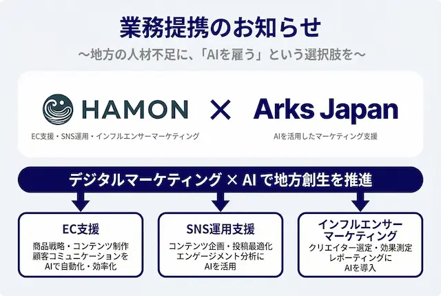 本提携は、地方創生の重要な課題のひとつである人材不足を、AIの力で乗り越えることを目指すものです。HAMONが地域の事業者とともに築いてきたEC・Instagram運用・インフルエンサーの現場知見と、Arks JapanのAI活用力を掛け合わせ、地域の事業者が持つ本来のポテンシャルを最大限に引き出すデジタルマーケティング支援体制を構築します。地域の魅力を全国・世界へ届ける力を、テクノロジーの側面から推進してまいります。