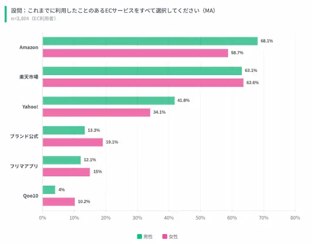 利用サービスではAmazonと楽天が突出し、合計で76%以上を占める結果となりました。消費者の購買行動は、特定のプラットフォーム上で完結する傾向が強まっています。