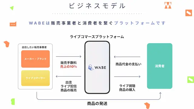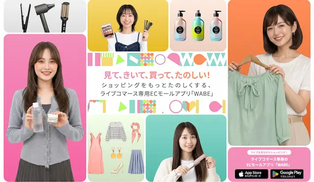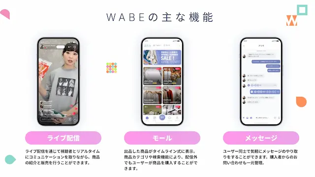 「WABE」は「見て(Watch)、きいて(Ask)、買って(Buy)、たのしい(Enjoy)」をコンセプトとした、ライブコマース専用のECモールアプリです。販売事業者(配信者)であるメーカー・ブランドやライブコマーサーと消費者(視聴者)を繋ぐ、ライブコマースプラットフォームとなっています。