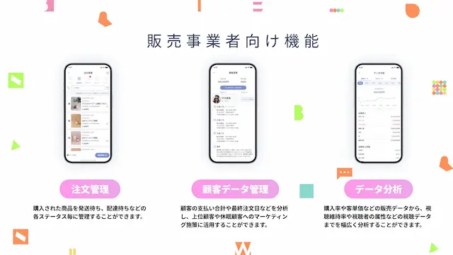 販売事業者がライブ配信を通じて消費者とリアルタイムにコミュニケーションを取りながら商品の紹介と販売を行うことができるほか、配信外でも商品購入ができるモール機能やSNSのDM機能がついていることも特長です。