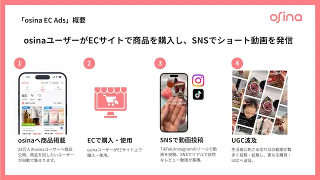 「osina EC Ads」は、osinaユーザーがECサイトで対象商品を購入し、その利用体験をTikTokやInstagramリールで発信・拡散する仕組みです。