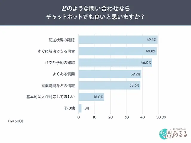 どのような問い合わせならチャットボットでも良いかを聞いたところ、上位に「配送状況の確認」49.4%、「すぐに解決できる内容」48.8%、「注文や予約確認」46.0%が挙げられました。チャットボットには、複雑な相談よりも確認や定型的な案内など、短時間で処理しやすい問い合わせが求められています。