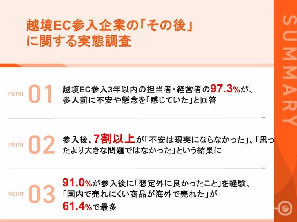 今回は、越境ECを開始してから3年以内の日本人EC担当者・経営者111名を対象に、越境EC参入企業の「その後」に関する実態調査を実施しました。その結果、参入前に不安を感じていた担当者・経営者が97.3%に上る一方で、73.1%が「不安は現実にならなかった」「思ったより大きな問題ではなかった」と回答したことが明らかになりました。