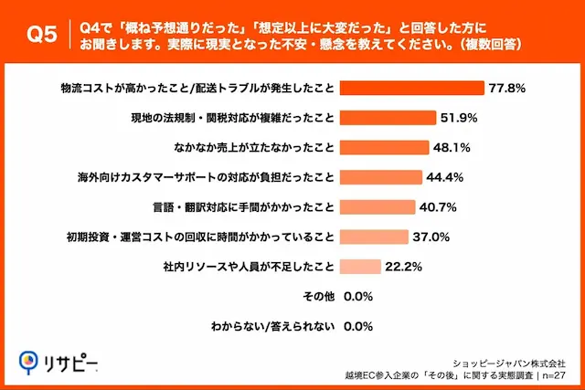 「Q5. Q4で「概ね予想通りだった」「想定以上に大変だった」と回答した方にお聞きします。実際に現実となった不安・懸念を教えてください。(複数回答)」(n=27)と質問したところ、「物流コストが高かったこと/配送トラブルが発生したこと」が77.8%、「現地の法規制・関税対応が複雑だったこと」が51.9%、「なかなか売上が立たなかったこと」が48.1%という回答となりました。