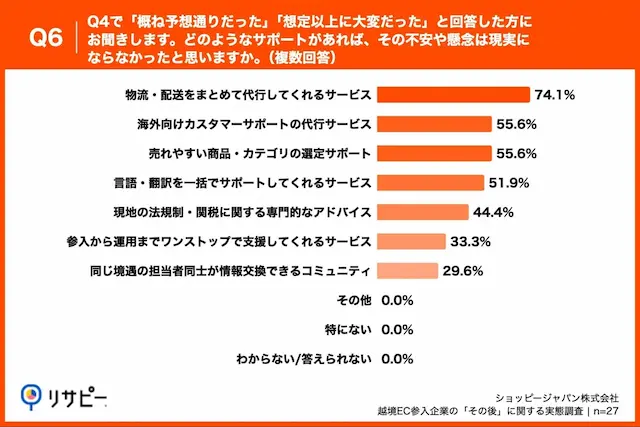 「Q6. Q4で「概ね予想通りだった」「想定以上に大変だった」と回答した方にお聞きします。どのようなサポートがあれば、その不安や懸念は現実にならなかったと思いますか。(複数回答)」(n=27)と質問したところ、「物流・配送をまとめて代行してくれるサービス」が74.1%、「海外向けカスタマーサポートの代行サービス」が55.6%、「売れやすい商品・カテゴリの選定サポート」が55.6%という回答となりました。