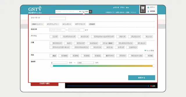 検索窓の横には複数の条件で商品を絞り込める「こだわり検索」機能が実装されており、「放送日時」をはじめとするさまざまな項目を組み合わせて検索できるため、ユーザーが希望に合った商品にスムーズにたどり着けます。