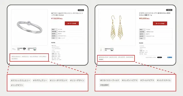 商品詳細ページでは、商品画像や説明文をもとにハッシュタグが生成・表示されるようになりました。このハッシュタグは商品の特徴に関連するタグを自動生成することで、類似商品や関連性の高い商品への直感的なアクセスを促進し、サイト内の回遊性向上に貢献します。