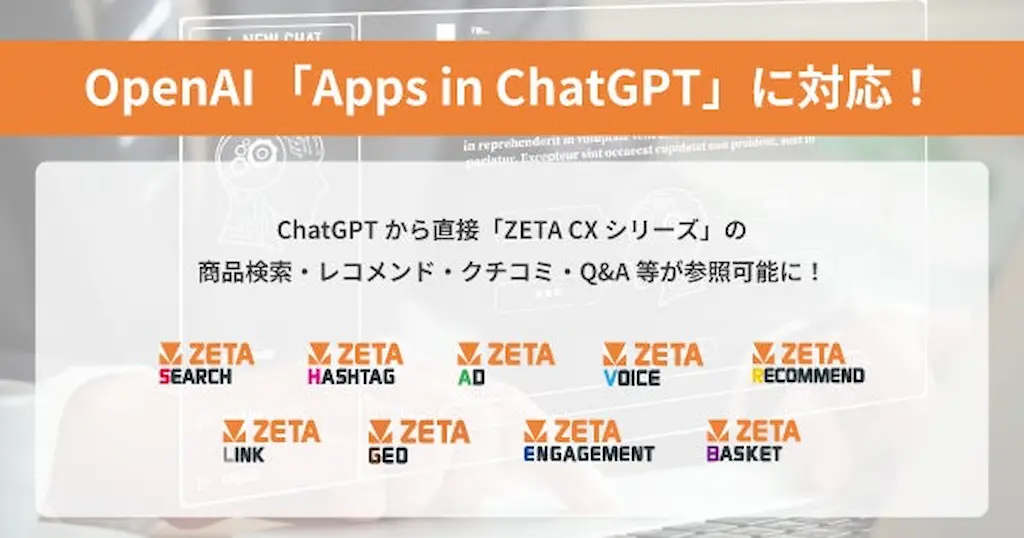 ZETA株式会社(本社:東京都世田谷区、以下ZETA)は、顧客体験価値の向上を支援するCX向上生成AIソリューション「ZETA CXシリーズ」を提供しています。このたび、ZETAはサイト内検索・EC商品検索エンジン「ZETA SEARCH」をはじめとする製品群が、OpenAI, Inc.(本拠地:アメリカ合衆国カリフォルニア州サンフランシスコ、代表者:CEO Sam Altman、以下「OpenAI」)が2025年10月から提供するChatGPT内アプリ機能「Apps in ChatGPT」に対応したことをお知らせいたします。