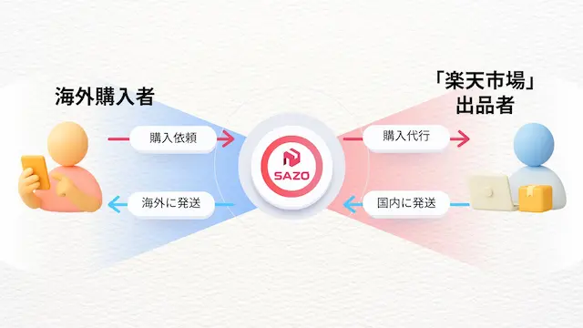 韓国ユーザーが「SAZO」(https://sazo.kr/)上で楽天市場の商品を購入すると、購入者に代わりSAZOが楽天市場の商品を手配します。楽天市場の出店者様は、SAZOの国内拠点へ商品を発送し、届いた商品をSAZOが購入者の元へ届けます。