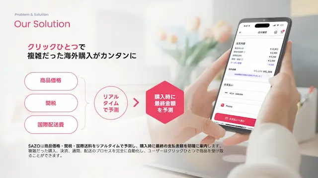 SAZOの最大の強みは、AIを用いた為替・国際配送料・関税の自動算出システムです。これにより、従来の越境ECや代理購入サービスに不慣れなユーザーでも、複雑な計算や手続きを意識することなく、自国のECサイトを利用するのと全く同じ感覚で購入できます。