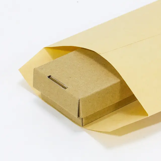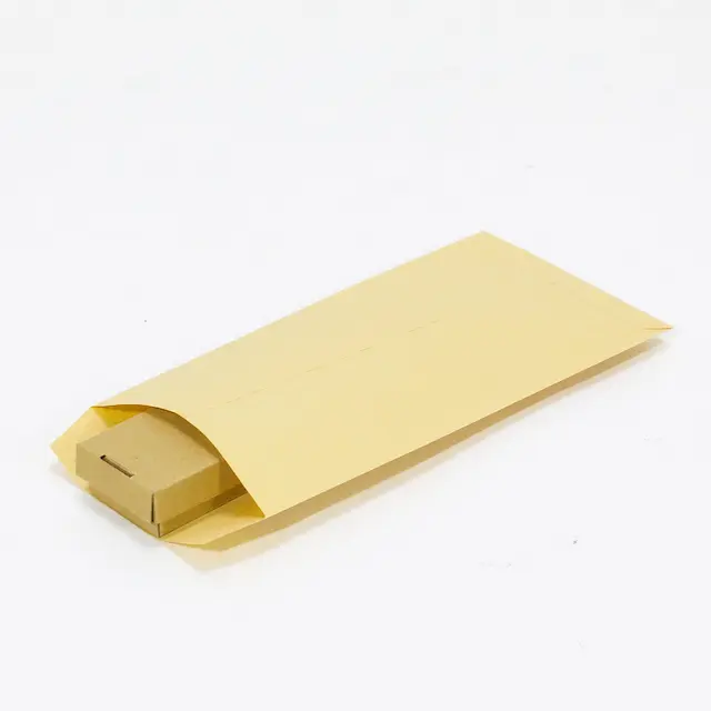 このダンボール箱は、アクセサリーやコスメグッズなどの小物雑貨のギフトラッピングにもおすすめです。箱の寸法は長形3号封筒に入るように調整され、深さはフリマアプリの配送規格(30mm以内)に収まるよう外寸25mmに設計されています。このため、箱を封筒に入れることで、定形外郵便などの配送サービスを利用して商品発送が可能です。
