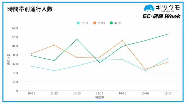 分析の結果、3日間を通じて14時から15時までの時間帯は、常に高い通行量を示す傾向がありました。このデータに基づき、ピーク時間帯に最適化したスタッフ配置を実施した結果、来場者の課題に対して迅速かつ密度の高い接客を実施することができました。